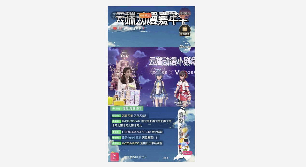 - 開場方式:兩位虛擬主播搭檔配合互動開場:聊天;提問抽獎(IP相關內容)
