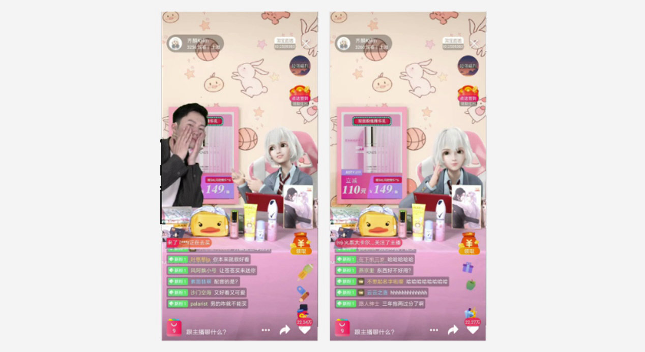 - 真人和虛擬主播互動:真人助手只具有商品演示作用,基本不出鏡不說話;虛擬主播對助手演示進行指導以及簡單互動,如“思然(助手名),可以幫我也留一瓶嗎?(此時助手用手勢表明不可以)哦,不行嗎,哎,太可惜了”(由期待到失望的角色演繹),又如“這個精華男生也可以用哦,你看思然多么白凈帥氣(此時助手臉部出鏡),他也在用哦(悄聲說)