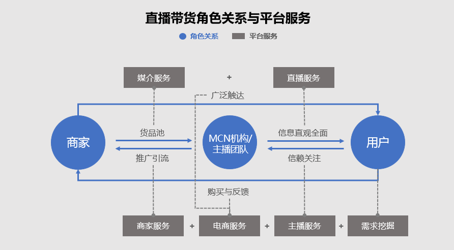 - 用戶作為信息和接收者和交易行為的發起者,可以選擇在任一環節加入或退出直播流程,看似處于流程末端但確是促成直播帶貨順利進行的核心。