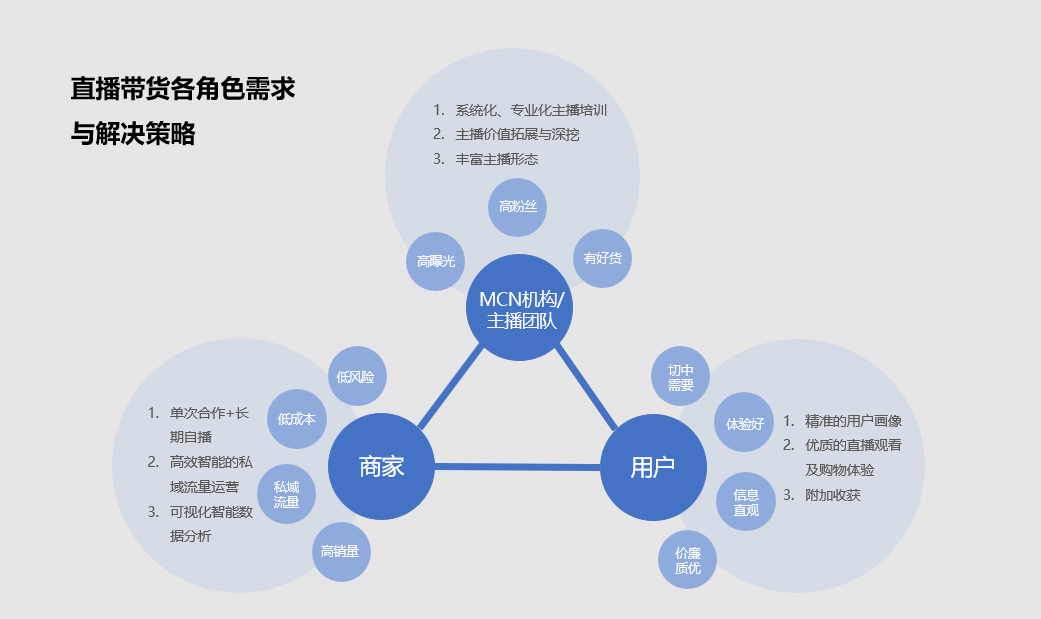 在契合用戶需求上,需要商家、MCN機構、平臺合力探索,平臺通過大數據等人工智能技術為前兩者提供決策支撐;而商家和MCN機構則需要制定面向目標用戶的合適的營銷及服務打法滿足用戶最大化利益,當然這里的利益不單單指金錢方面。