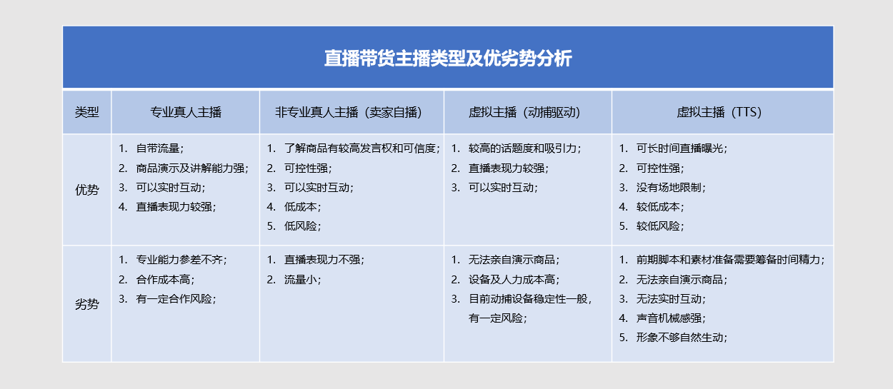 所以在直播帶貨場景下,主播作為一種媒介必備的價值是:本身的吸粉特質、商品介紹推廣能力和用戶互動能力,結合之前分析的痛點,還應具備的加分項是:低成本、高穩定性、可長時曝光。