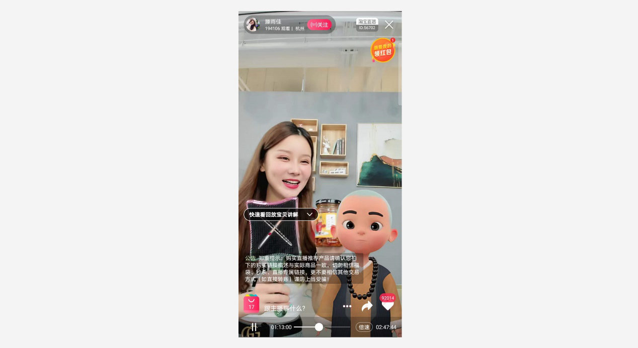 - 真人和虛擬主播互動表現:互動非常積極,對話自然流暢;主播向一禪提問聊天、快問快答(圍繞角色設定生活向);提問收集來的粉絲問題(幫助粉絲解答人生困惑,符合角色設定);有一定的引導性(一禪:“有施主問我女朋友生氣了怎么辦”,主播拿出了之前講解的商品;主播:很多粉絲問題沒辦法在這里一一解答,我們帶來了一禪的漫畫書(商品介紹))